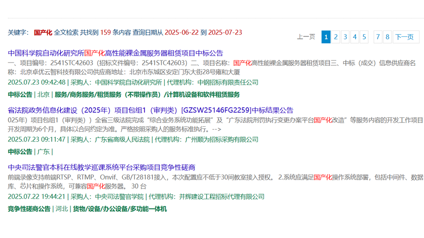 打開中國政府采購網(wǎng),輸入關(guān)鍵詞“信創(chuàng)”“國產(chǎn)化”,會發(fā)現(xiàn)大量政府采購文件上,凡是涉及計算機、服務(wù)器等信息化設(shè)備的項目,幾乎都明確提出需采用國產(chǎn)CPU(如飛騰、兆芯等)、國產(chǎn)操作系統(tǒng)(如麒麟、統(tǒng)信UOS等),以及國產(chǎn)數(shù)據(jù)庫和中間件平臺。